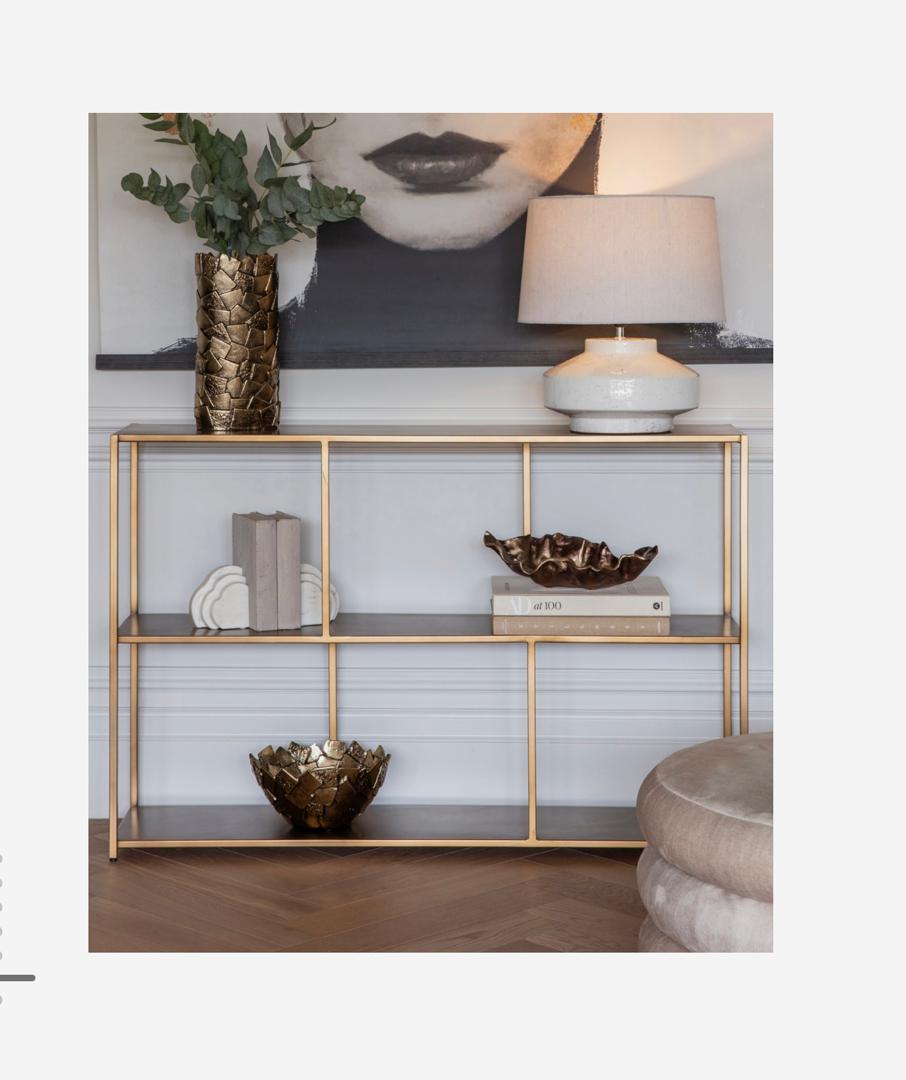 Part of the Brooks collection, this console table can be paired with matching shelving units and coffee tables, available in both charcoal and gold finishes, for a cohesive and modern interior scheme.