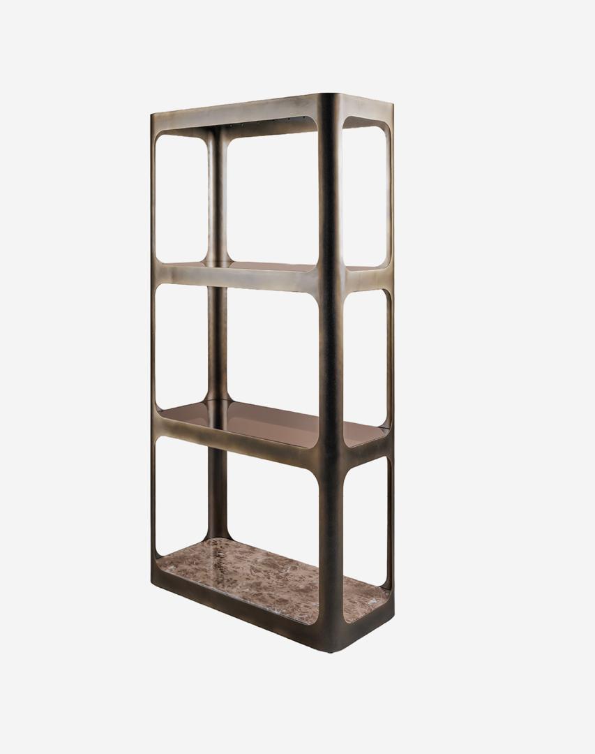 The interplay of metal, glass, and marble creates a layered aesthetic that feels both contemporary and timeless. Its vertical structure makes it ideal for living rooms, offices, or styled interiors where height and visual interest enhance the overall composition.