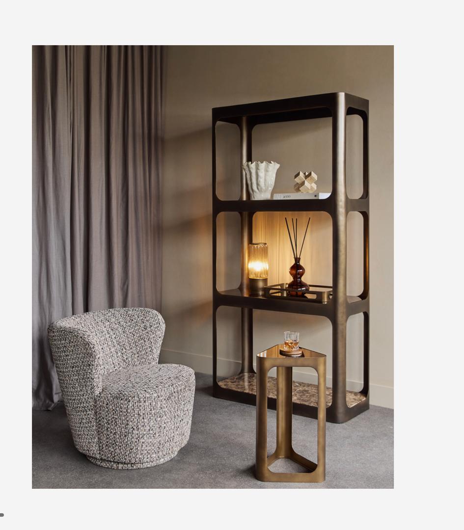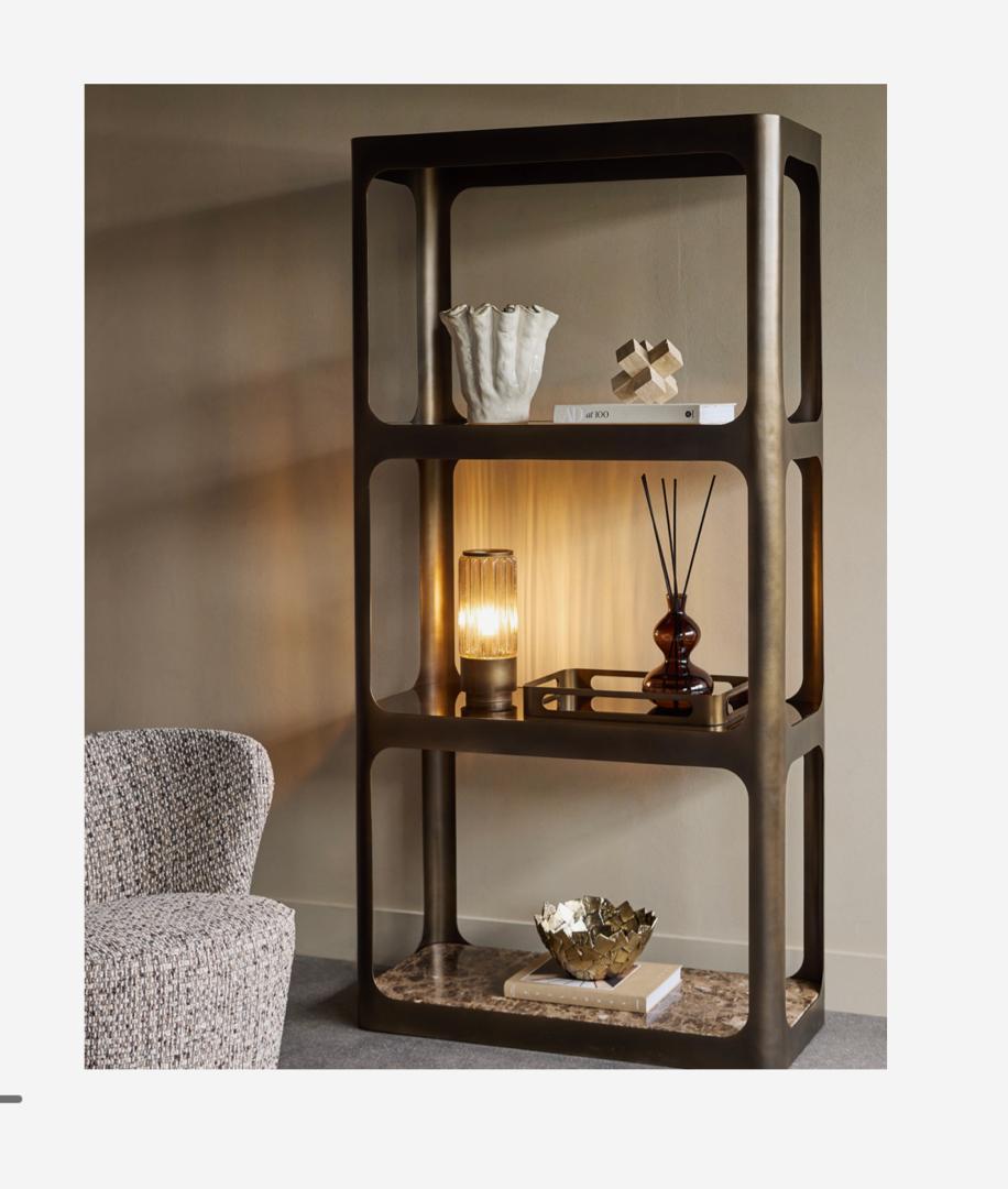 Framed in smoked bronze-finished iron, the shelving unit features clean, linear proportions that create a strong yet balanced silhouette. The open-frame design maintains a light and airy feel, allowing the materials to stand out without overwhelming the space.