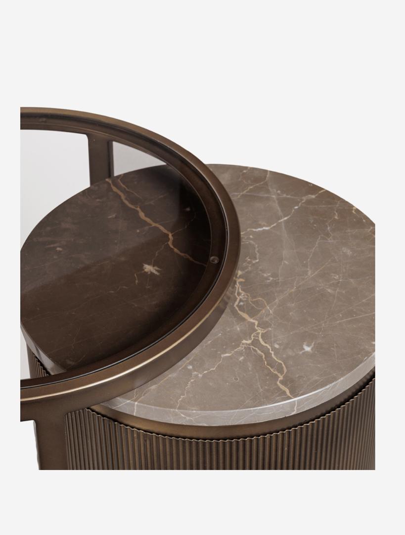 The taller table features a sleek tinted glass top that creates a refined contrast against the shorter table’s luxurious Italian Royal Gold marble surface. This carefully selected natural marble is known for its rich veining and tonal variations, ensuring that every piece is unique and full of character.
