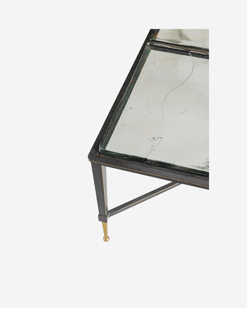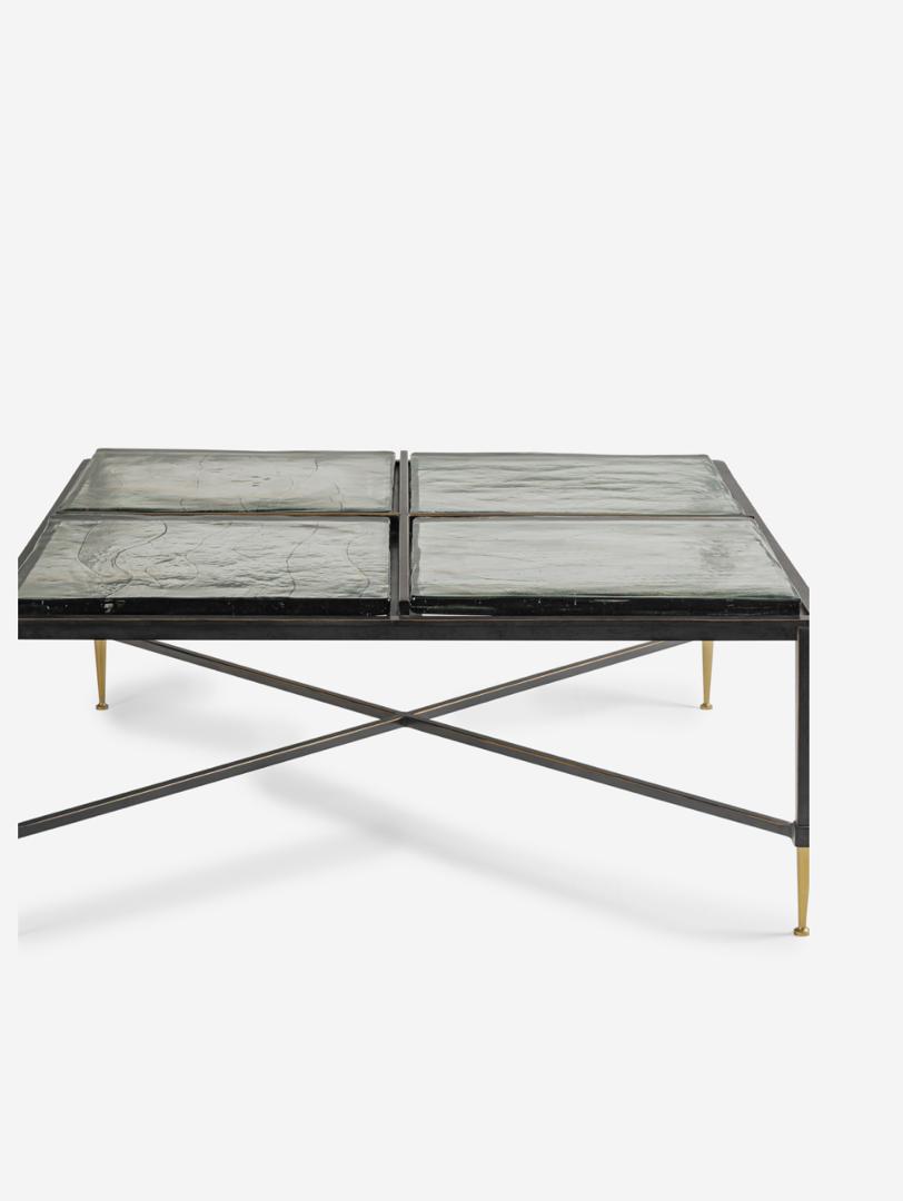 A refined square coffee table featuring a thick brick-patterned glass top set within a slender iron frame in a brushed satin gilded oak finish. Elegant and sculptural, it adds warmth and texture to contemporary living spaces.