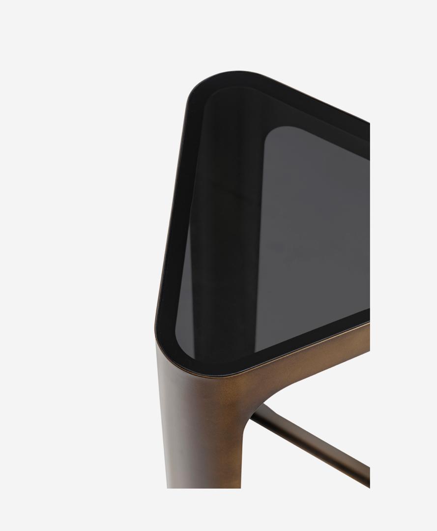 The tabletop features smooth black tinted glass, offering a sleek and polished surface that enhances depth and contrast within the space. The dark glass finish pairs beautifully with the warm tones of the metal frame, creating a balanced and cohesive design.