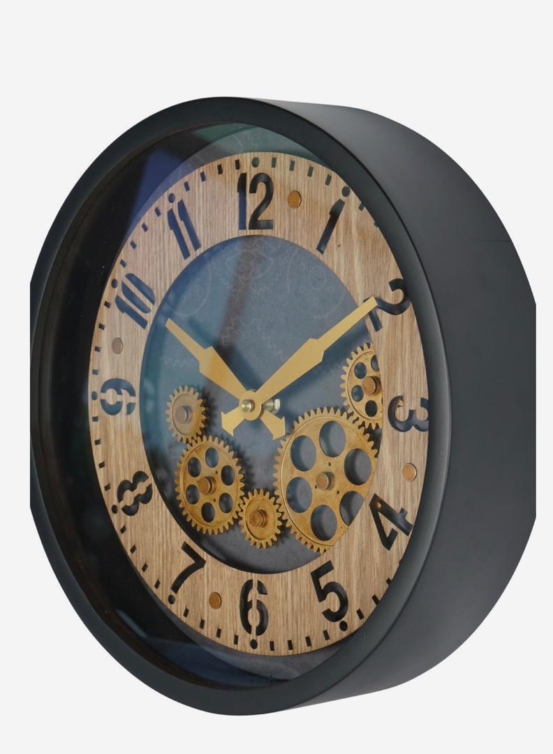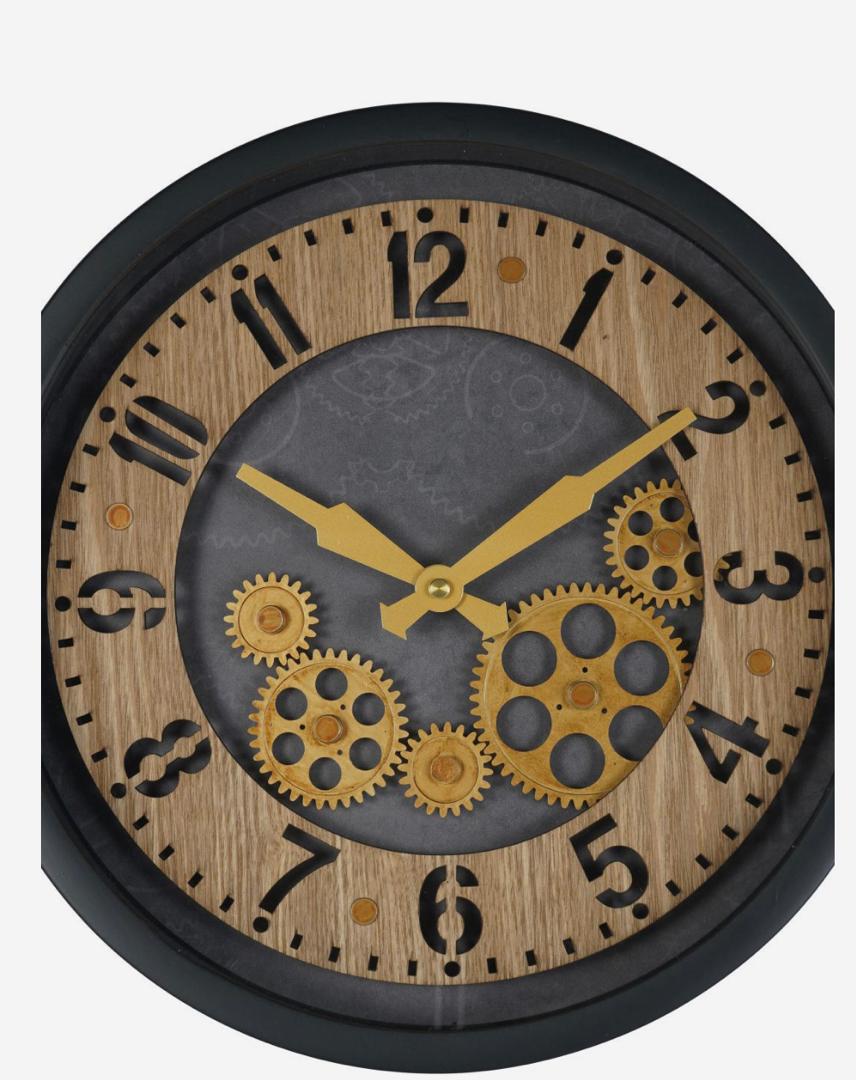 At the centre of the clock, bold gold hands stand out against the deep black dial, creating a refined contrast that makes the time easy to read while adding a luxurious touch. Surrounding the dial are five beautifully designed brass-gold moving cogs that continuously rotate, bringing a dynamic mechanical aesthetic that captures attention and elevates the overall décor.