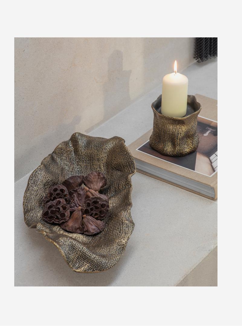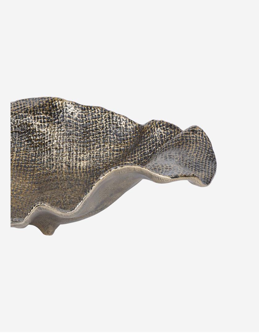 Cast from aluminium, the platter features an ombre antique brass finish that transitions across the surface, adding warmth and tonal richness. The woven-effect texture enhances its visual complexity, while the undulating edges evoke the natural flow of metal in motion.