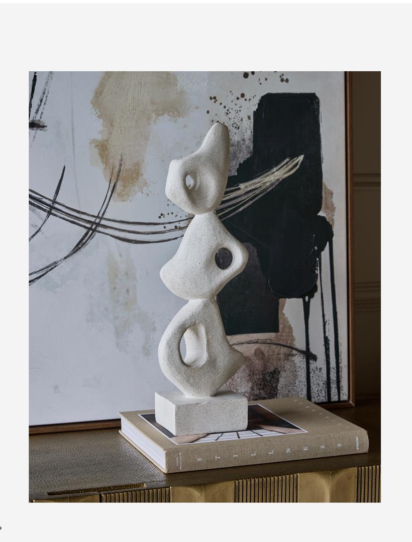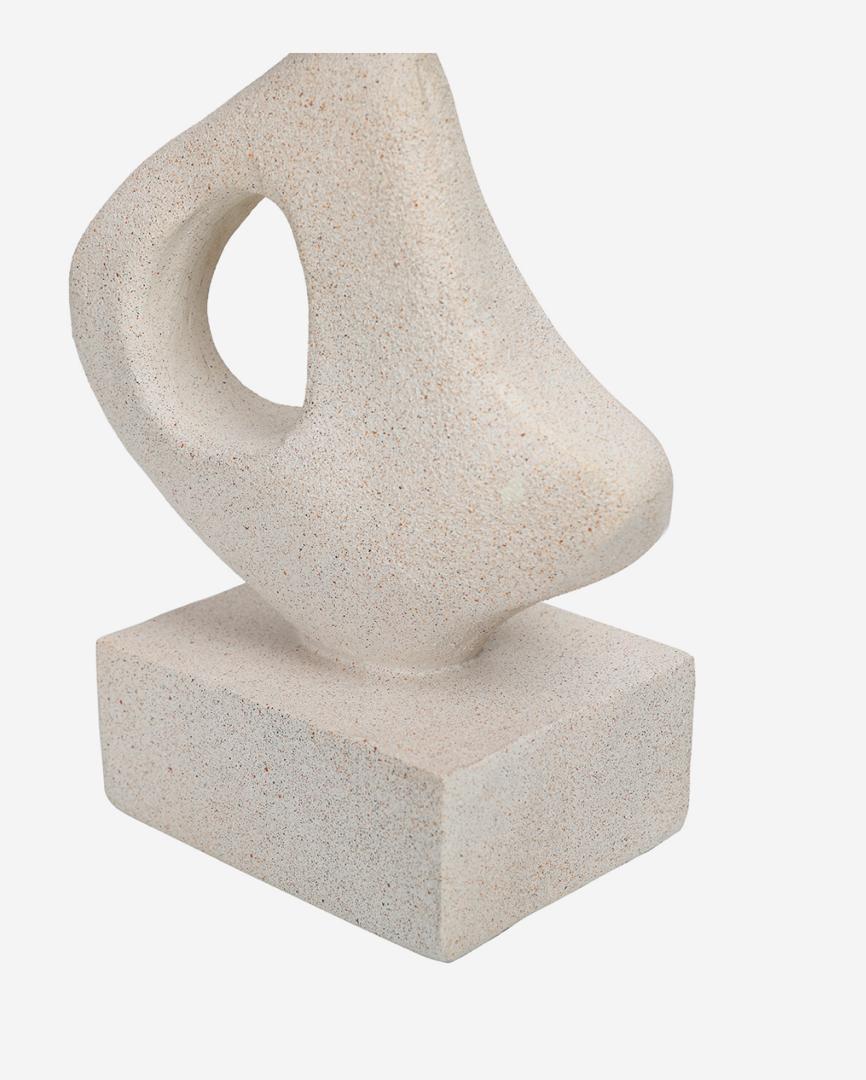Crafted from a stone-effect resin blend, the sculpture is finished with a gently grainy, sandy texture that evokes the look and feel of hand-carved limestone. Its pale, natural tone enhances its organic character, allowing it to integrate effortlessly into both minimalist and richly layered interiors.