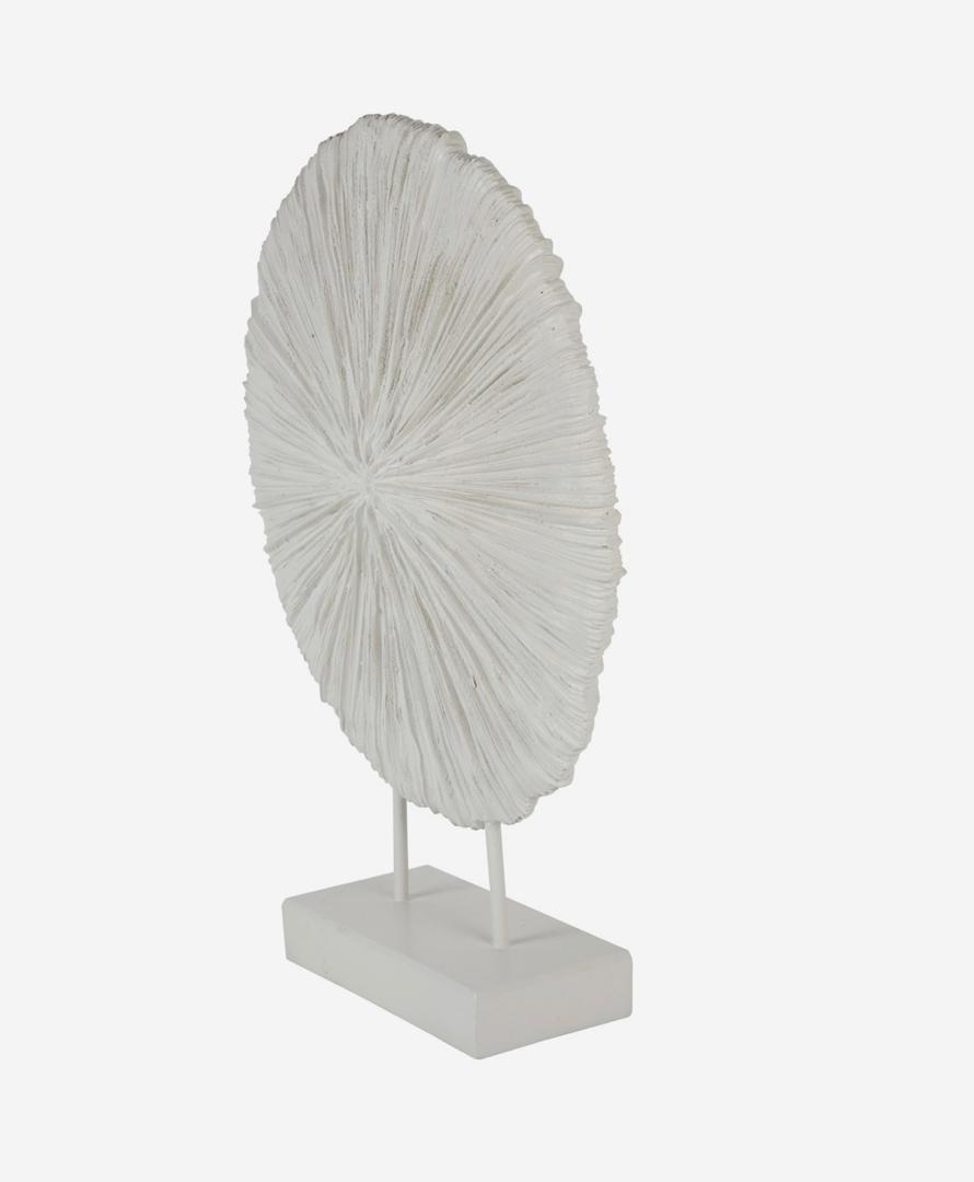 Crafted from durable resin, the piece is finished in a matte white tone that enhances its sculptural clarity while allowing the surface detailing to stand out. Each sculpture carries subtle variations in texture, ensuring a unique finish that adds to its artisanal appeal.
